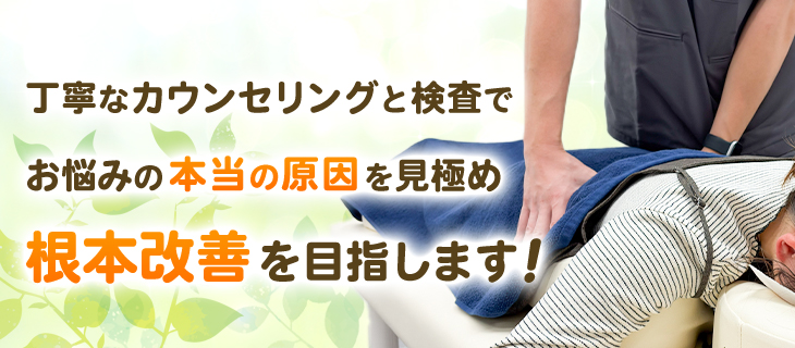 痛みや不調の出る場所はそれぞれ違いますが、多くの場合、本当の原因は別の場所に存在しています。当院では、その本当の原因に対して施術をさせていただき「根本改善」を目指します。